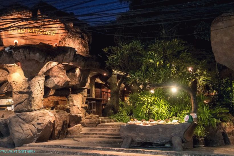 Územie reštaurácie Dino Park (Dino Kitchen) má komplex štruktúra: veľa úrovní, koľaje, mosty a chodníky atď ľudia so zdravotným postihnutím sem prišli nie čo znamená, bohužiaľ. Vonkajšia reštaurácia je zariadená originálnym nábytkom Nábytok z doby kamennej (ak taký štýl existuje). zastrešená časť reštaurácie má umelé stromy, napr nášho domáceho jedľa vyzerá trochu divne, ale so zvyškom interiéru vyzerá úplne organicky. Mimochodom, je oveľa zaujímavejšie sem chodiť večer s umelými osvetlenie – atmosféra je úplne odlišná od denného svetla.